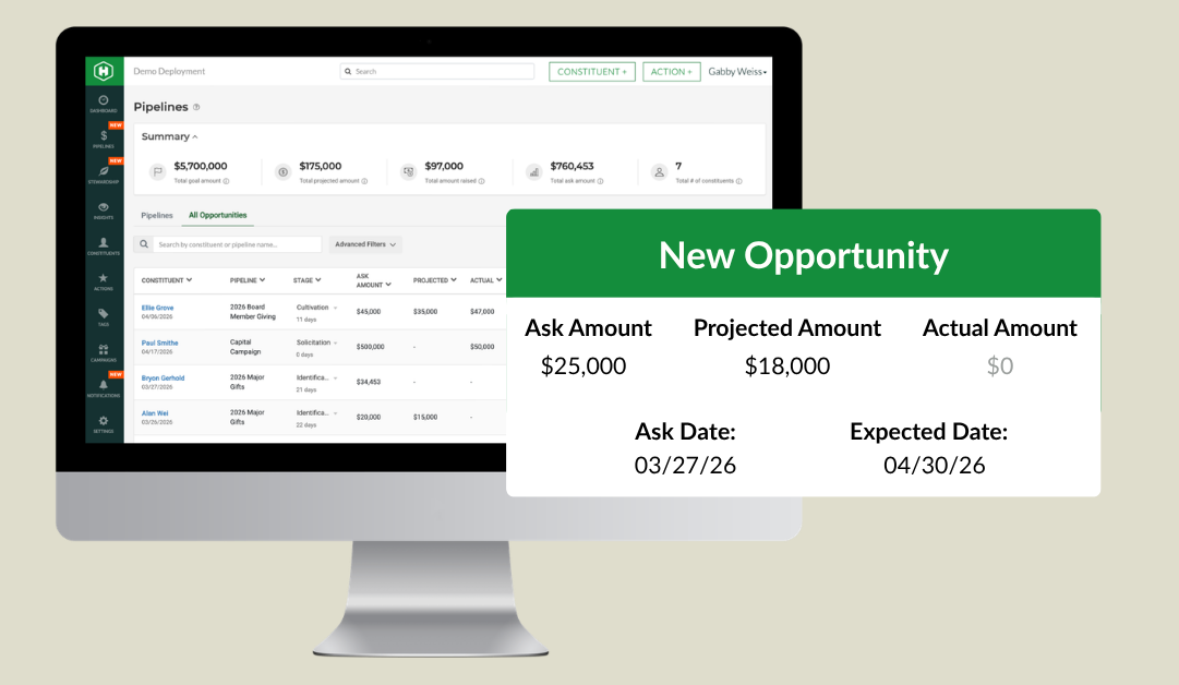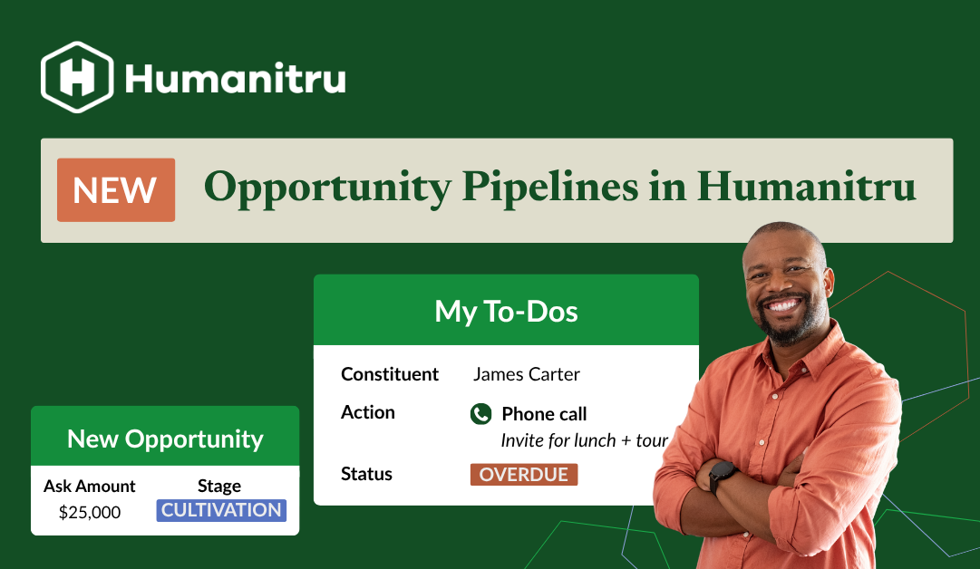 Opportunity Pipelines in Humanitru provides a structured, effective way to manage high-touch fundraising programs - including major gifts, grants, planned giving, and corporate partnerships - from your first outreach all the way to a closed gift.