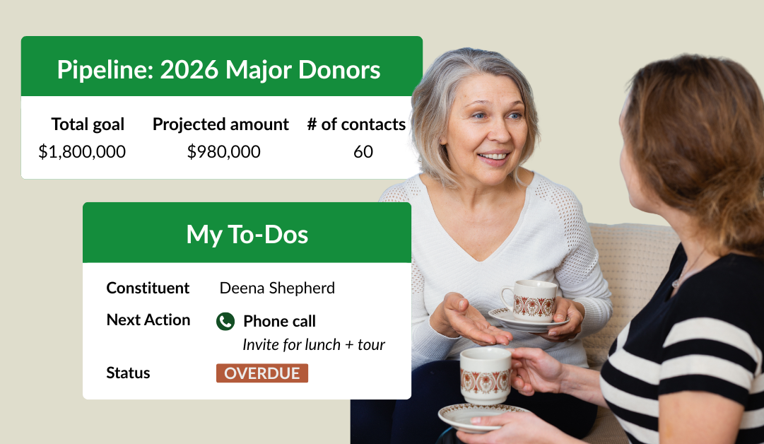 If you're a fundraiser, you know that securing large gifts can unlock transformational opportunities for organizational growth. To manage hundreds of personal relationships with the donors in your portfolio, you need tools that help you keep everything on track, without adding hours of data management to your day.